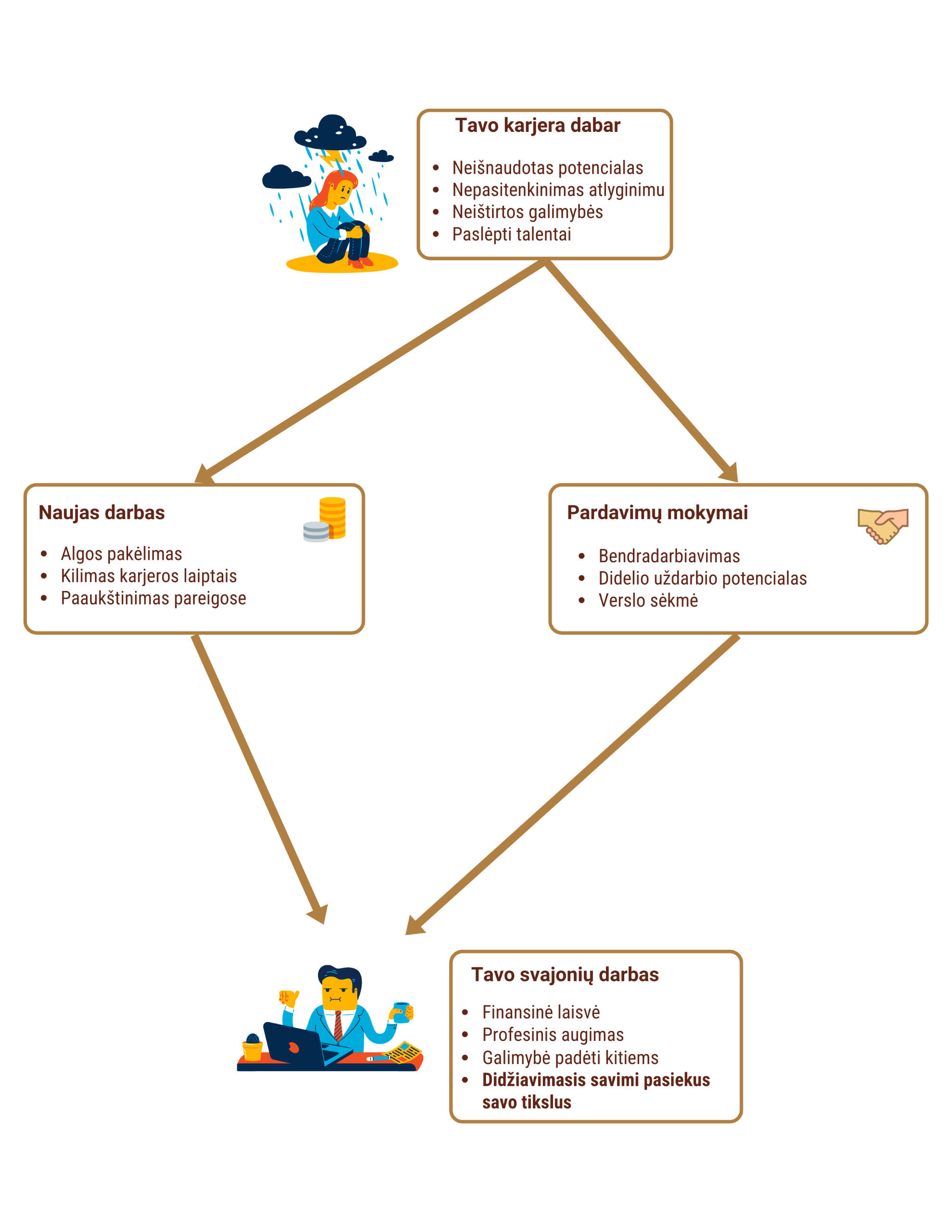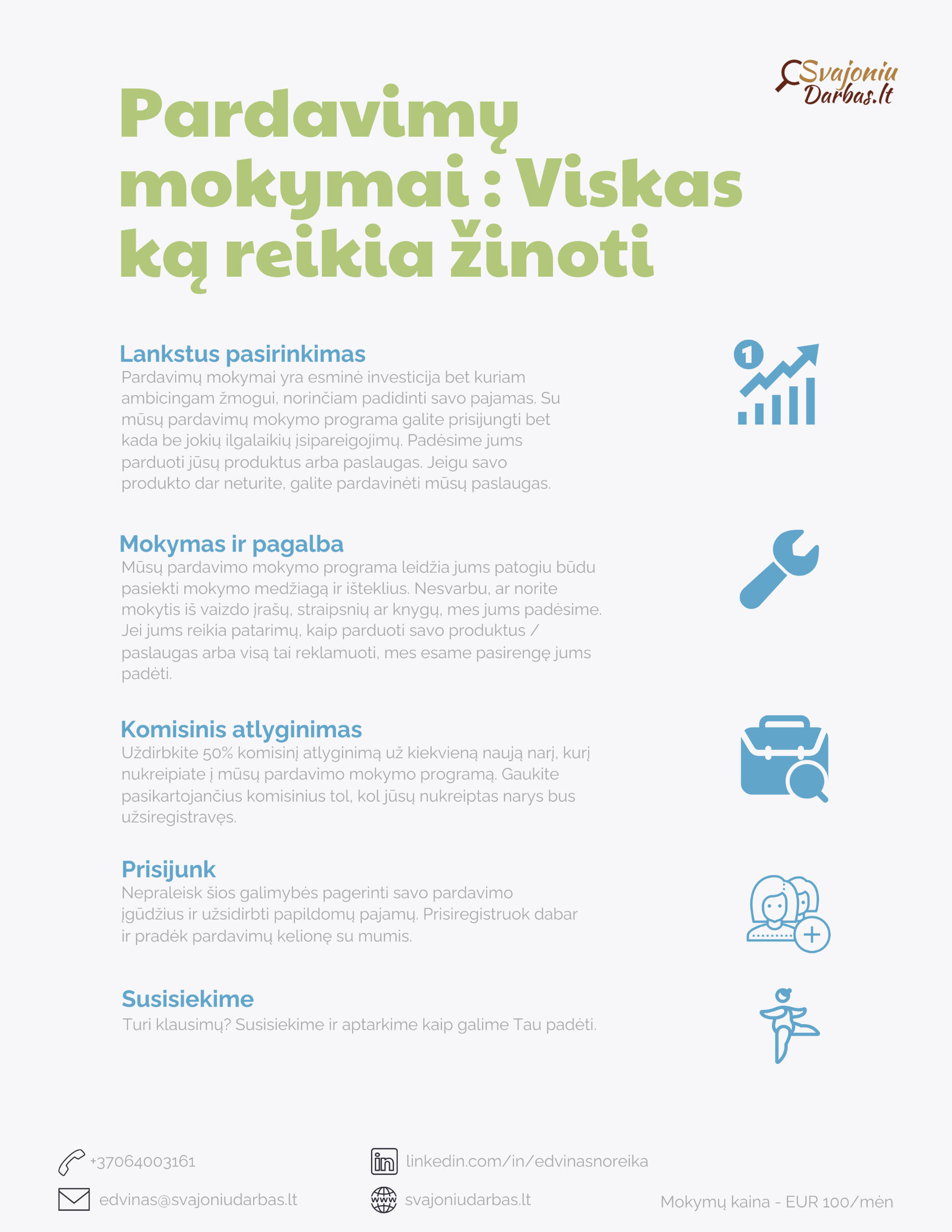 Tavo svajonių darbas nėra toks tolimas kaip gali atrodyti. Siūlome paslaugas, kuriuos padės tau save realizuoti ir pasiekti savo svajonių darbą, kad ir koks jis būtų.Mes siekiame ne tik jums greitai surasti gerai apmokamą darbą, sukurti nepriekaištingą CV, bet ir siūlome efektyvius pardavimų mokymus, pritaikytus būtent tavo profesijai ir poreikiams. Mes įsipareigoję suteikti jums visapusišką paramą profesinėje karjeroje ir asmens tobulėjimo kelyje.