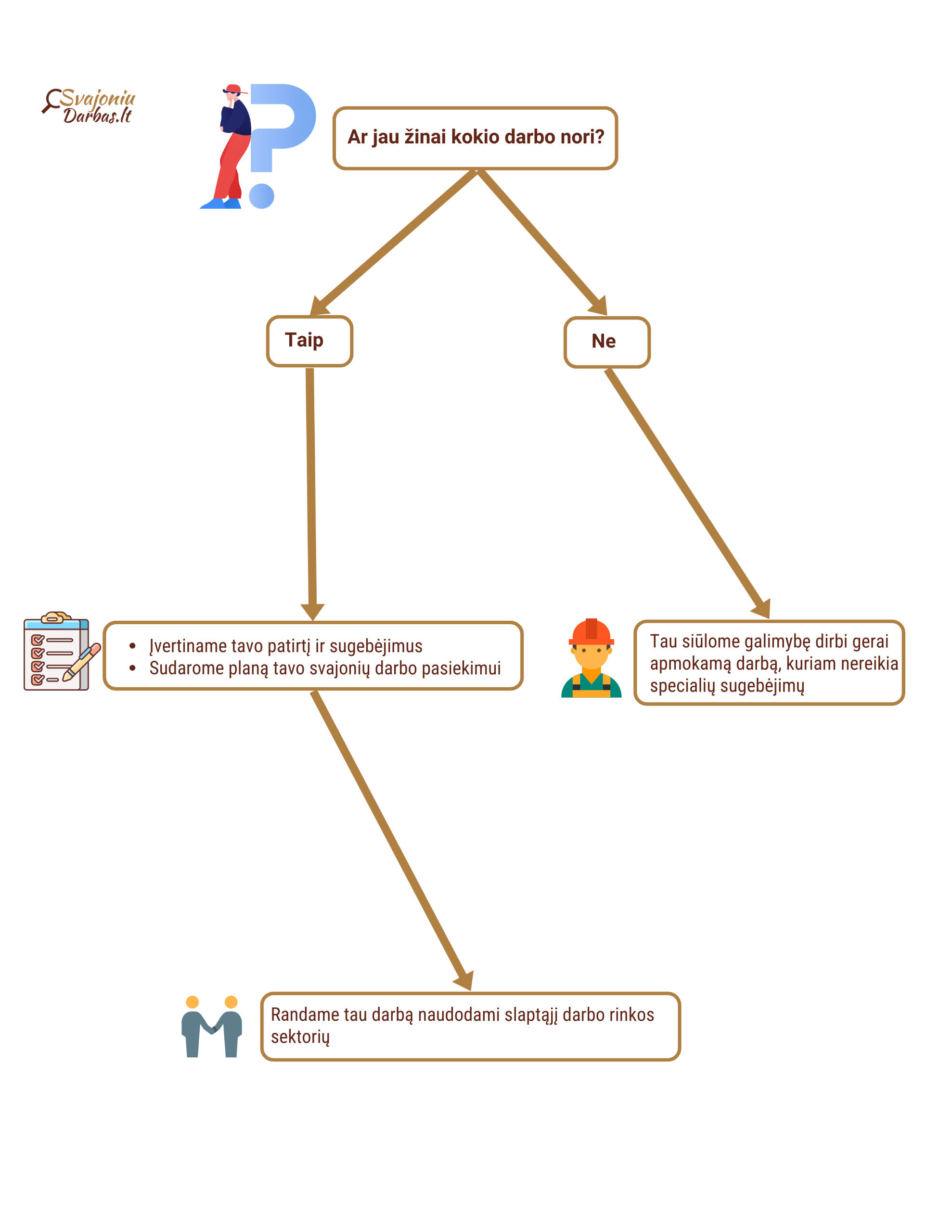 Prieš pradedant darbo paiešką reikia įvertinti ar jau žinai koks yra tavo svajonių darbas?Jeigu žinai ko nori - reikia įvertinti tavo turimą patirtį ir sugebėjimus, ir tada sudaryti planą tavo svajonių darbo pasiekimui. Tada, pasinaudoję slaptuoju darbo rinkos sektoriumi (angl. "hidden job market") - darbo vietose, kurios nėra paskelbtos skelbimuose arba nėra viešai skelbiamos, tiesiogiai susisiekę su darbdaviais, gautume jūsų išsvajotą darbo vietą. Apie 80% laisvų darbo vietų nėra skelbiamos viešai, todėl naudojame šį metodą jūsų darbo suradimui.Jeigu nežinai koks yra tavo svajonių darbas - tai yra visiškai normalu. Tau galime parūpinti gerai apmokamą darbą, kuriam nereikia jokios patirties ar specialių sugebėjimų. Šį darba galėsi dirbti tol, kol sugalvosi ką ištikrųjų nori veikti.Darbo pavyzdys: statybos, naftos gamyklos:
